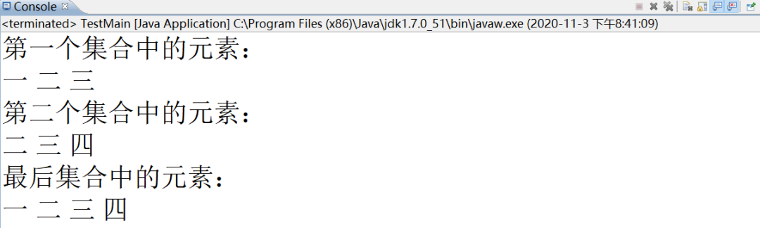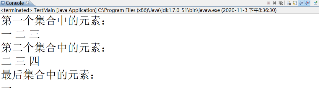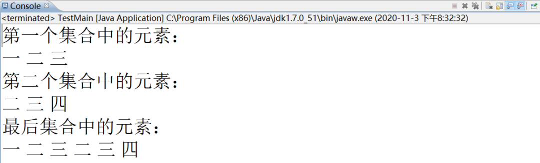 代码分析,我们先使用差集,过滤一下list1中所有在list2中出现的元素,出现了就删除,也就是remoAll方法调用完之后,list1中还剩 “一” ,然后list2中还有 “二、三、四” ,两个一并集,自然结果就是 “一、二、三、四” 。