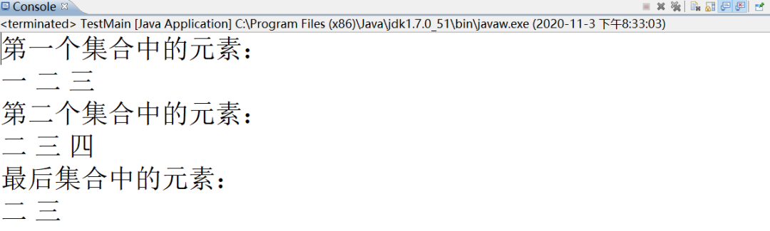 即两个集合中都有的元素,一个有另一个也有的,代码如下:(省略声明和初始化集合的代码,和第一个示例一样)