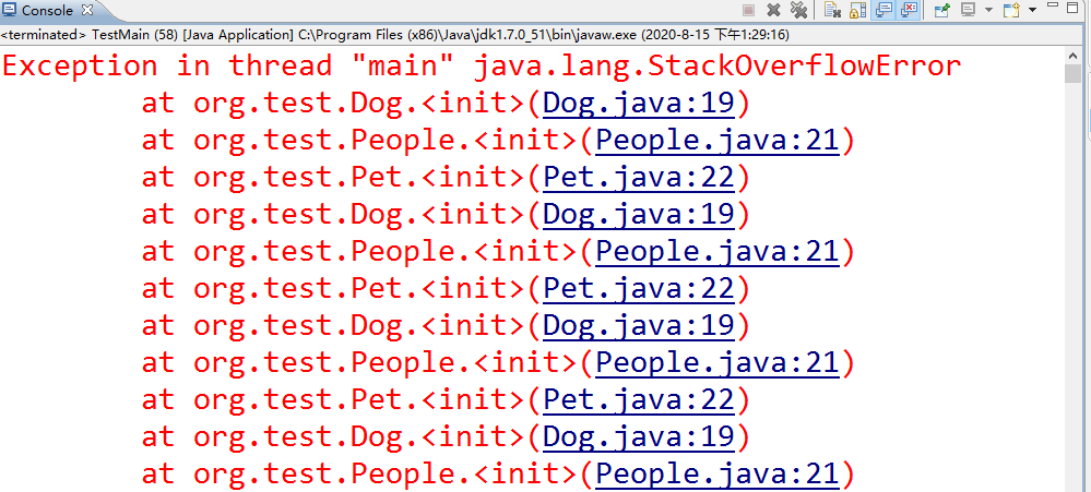 然后在继续调用Dog类的无参构造方法,JVM在调用父类的无参构造方法,在初始化People类,再调用Dog构造方法……一直在循环,就造成了死循环,这个异常固然就出来了。