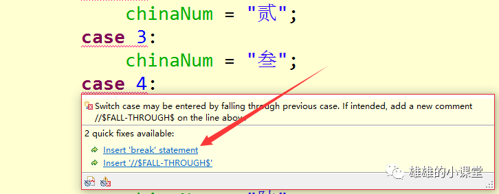 我们回来在看看程序,哦,原来是case后面忘记加break了,程序从case2执行完之后继续执行,chinaNum的值从“贰”、“叁”、“肆”一直到“玖”才结束,因为在switch中,自始至终都未发现break,所以就一直执行。