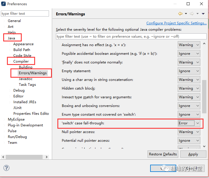 修改编辑器的警告级别,比我在myeclipse或者eclipse中,一次点击windows–>preferences–>java–>Compiler–>Errors/Warnings–>Potential programming problems–>”’switch’ case fall-througn”,