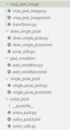 然后是人体图像裁剪、人体关键点后处理、关键点画图等模块,分别对应crop_ped_image、single_pose_post、draw_single_pose等通用功能单元: