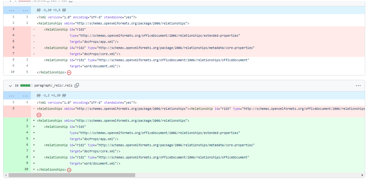 首先,让我们删除未使用的内容并关注包含主要文本元素的 document.xml。 删除文件时,请确保已从其他 xml 文件中删除了对其的所有关系引用。 这是一个关于我如何清除对 app.xml 和 core.xml 的依赖项的代码差异示例。 如果您有任何未解决/缺失的引用,MSWord 将认为该文件已损坏。