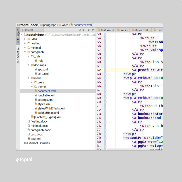 DOCX 文件是 XML 文件的 ZIP 存档。 如果您创建一个新的、空的 Microsoft Word 文档,在里面写一个单词“Test”并解压缩它的内容,您将看到以下文件结构: