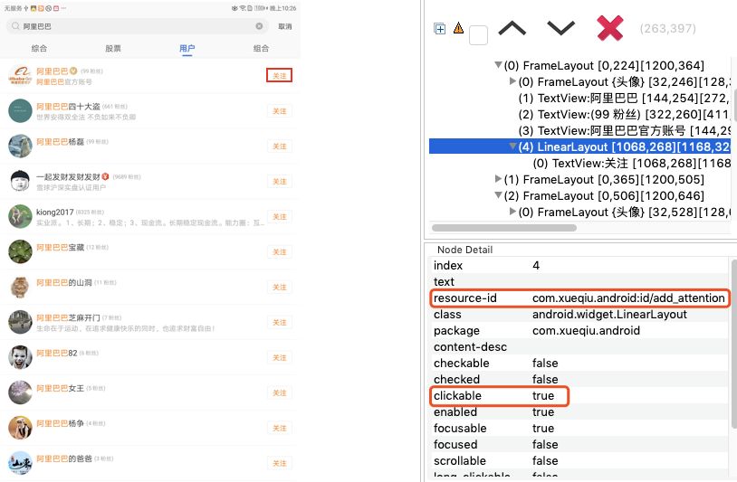 在“股票”和“用户”tag页中,“加自选”和“关注”控件的clickable及id属性一样。
