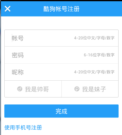 很多界面开发中都会设置一些下划线,或者分割线,从而使得界面更加整洁美观,比如下面的酷狗音乐的注册页面: