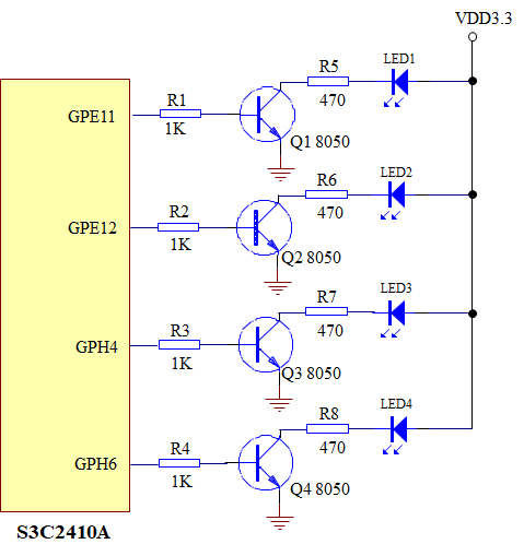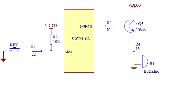输入实例: S3C2410A的GPF4口(输入口)连接一个独立按键KEY1。当KEY1键按下时,GPH10口(输出口)上的蜂鸣器便发出声响,松开按键时,蜂鸣器便停止发声。