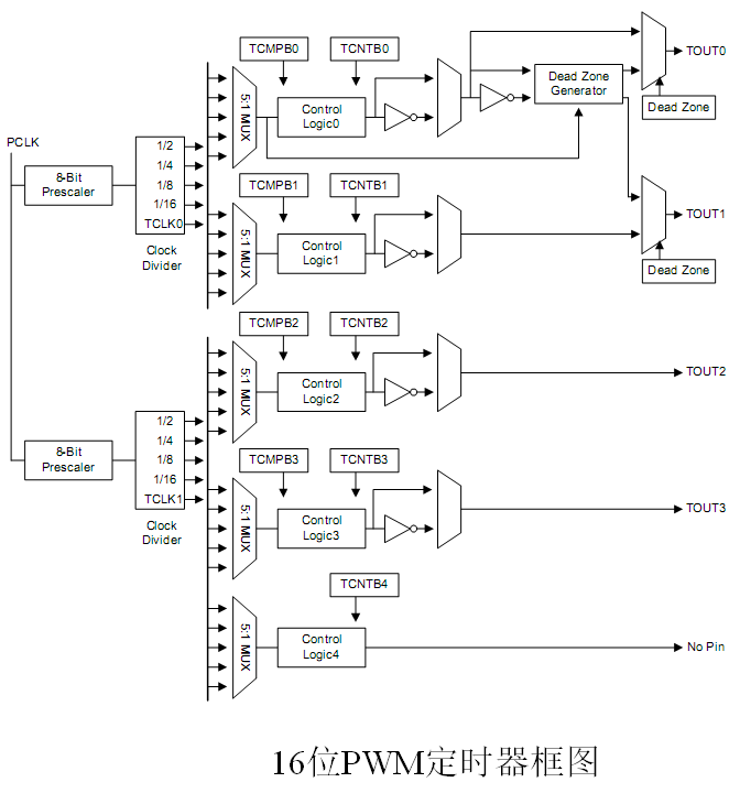 S3C2410有5个16位定时器,其中定时器0、1、2、3、有PWM功能,定时器4只是一个内部定时器而无输出引脚。定时器0和定时器1具有死区发生器(dead-zone generator)。
