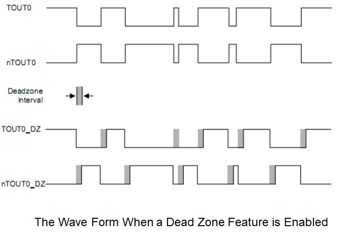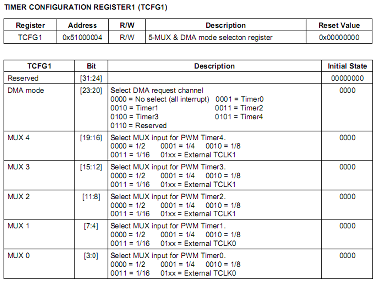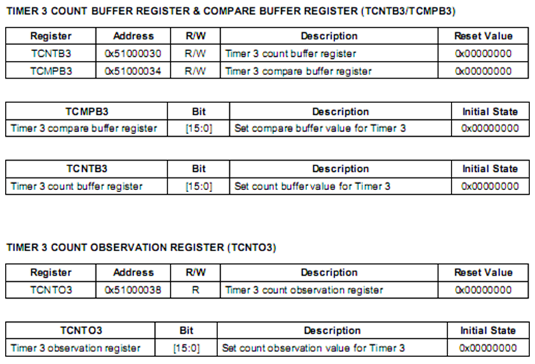 对于具有PWM功能的定时器,其控制逻辑中还有一个比较寄存器,当比较寄存器的值与定时器比较缓冲寄存器TCMPBn的值相等时,定时器控制逻辑改变输出逻辑。这样就能控制PWM输出的高电平或低电平的时间。