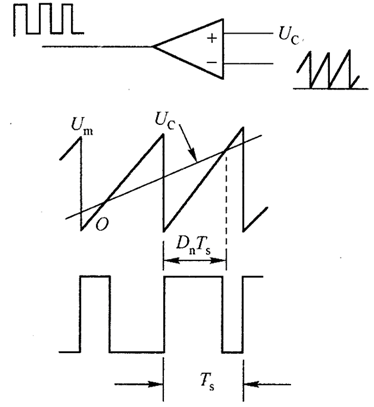 固定幅度、斜率和周期的锯齿波加在比较器的反向端,调整信号Uc加在比较器的正向端,当Uc>锯齿波信号的电平时比较器输出高电平信号,反之输出低电平信号。这样Uc的大小决定了脉冲占空比。当Uc为一模拟信号,随着时间变化时,脉冲占空比也会随着时间变化,变化的规律和Uc一样,也就是实现了Uc对方波的PWM调制。