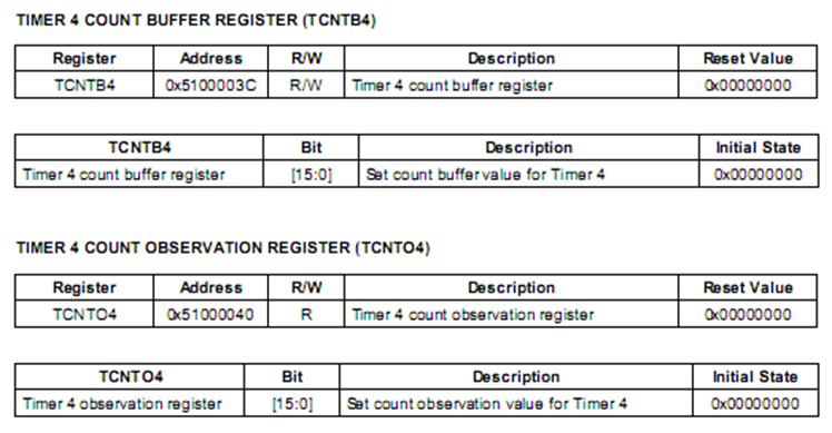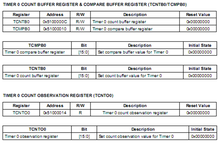 每个定时器都有自己的16位减法计数器,该计数器由定时器时钟(来自于时钟除法器或外部时钟)驱动,当定时器计数器值减到0时,定时器发出中断请求,相应的定时器计数缓冲寄存器TCNTBn将自动载入计数器,继续下一次操作。