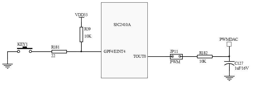 具体要求为:使用S3C2410A的TOUT0口输出PWM信号,使用RC滤波电路实现D/A转换。通过检测按键KEY1来改变PWM的占空比,改变D/A输出的电压值,输出电压分别为0.0V、0.5V、1.0V、1.5V、2.0V、2.5V和3.0V。