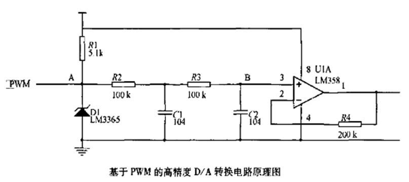 图中A点的PWM波经过两级阻容滤波在B点得到直流电压信号,实现了D/A转换功能。由于放大器的输入阻抗很大,二级阻容滤波的效果很好,B点的电压纹波极小,满足高精度要求。输出放大器工作在电压跟随器方式,输出范围在(0—5)V之间。