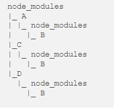 假设我们又安装了两个 module C 和 D,则 node_modules 文件夹变为如下结构: