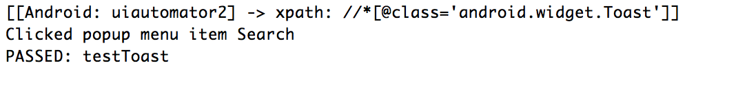 上图中 “Clicked Popup menu item Search” 就是 Toast,但它通常在页面上停留的时间只有 2 秒左右,通过 Appium Inspector 一般不容易获取到这个元素。