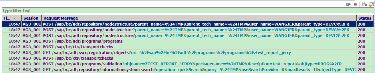 现在我们可以知道用户在 Eclipse 中的操作,是通过 HTTP Get 和 HTTP Post 发送到 ABAP 后端系统的,并在 ABAP 后端进行处理。 双击每一行以获得详细视图。