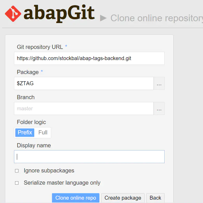 将ADT标签管理的后台实现使用abapGit pull到当前的ABAP系统,点击Clone online repo: