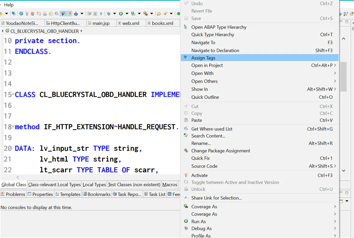 在ABAP Development Tool里添加标签的方式非常直接,右键菜单里选择 Assign Tags 即可。凡是使用过云笔记里标签添加和管理功能的朋友们,对此应该非常熟悉。