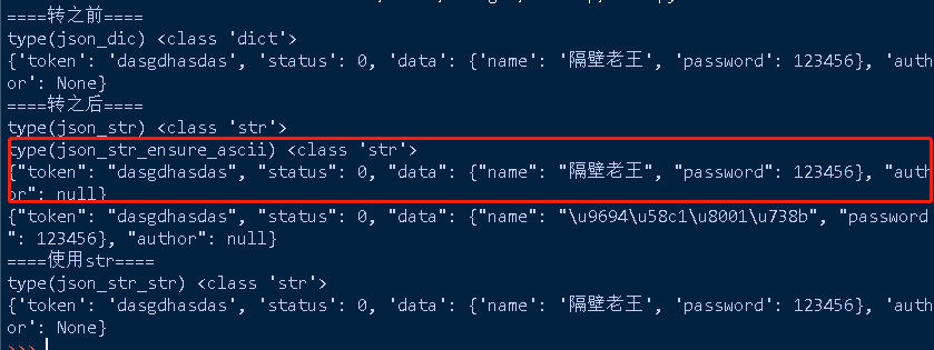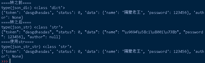 其实就类似于直接用str()进行强制转换,但是dumps()转了之后,有中文的被编码了,那这个时候如果有中文的话,在转换的时候,加ensure_ascii=False,如下: