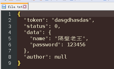 json_dic = {"token":"dasgdhasdas", "status":0, "data":{"name":"隔壁老王", "password":123456}, "author":None}