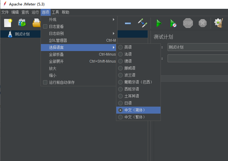 选择Options—>Choose Language—>选择其他语言(例如:Chinese(Simplified)简体中文)