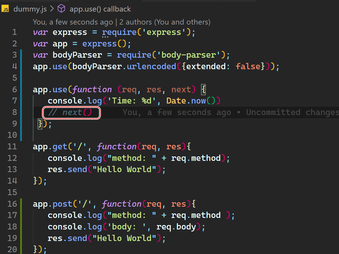 如果删除了 next 调用,其他的中间件将永远没有机会得到执行: