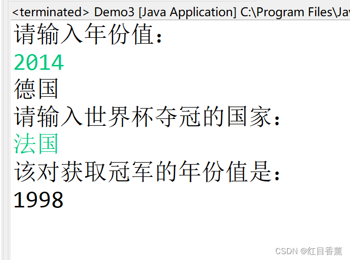 从命令行读入一个字符串,表示一个年份,输出该年的世界杯冠军是哪支球队。如果该 年没有举办世界杯,则输出:没有举办世界杯。