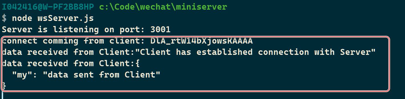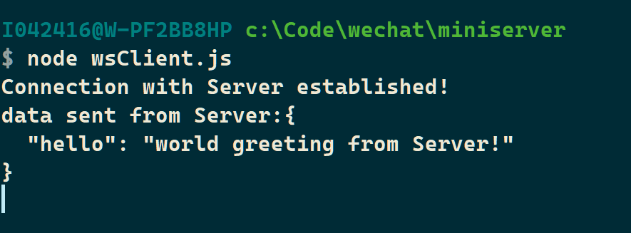 新开一个命令行窗口,使用 node wsClient.js 启动客户端,能看到客户端打印出的成功建立连接,以及从服务器端发送过来的数据: