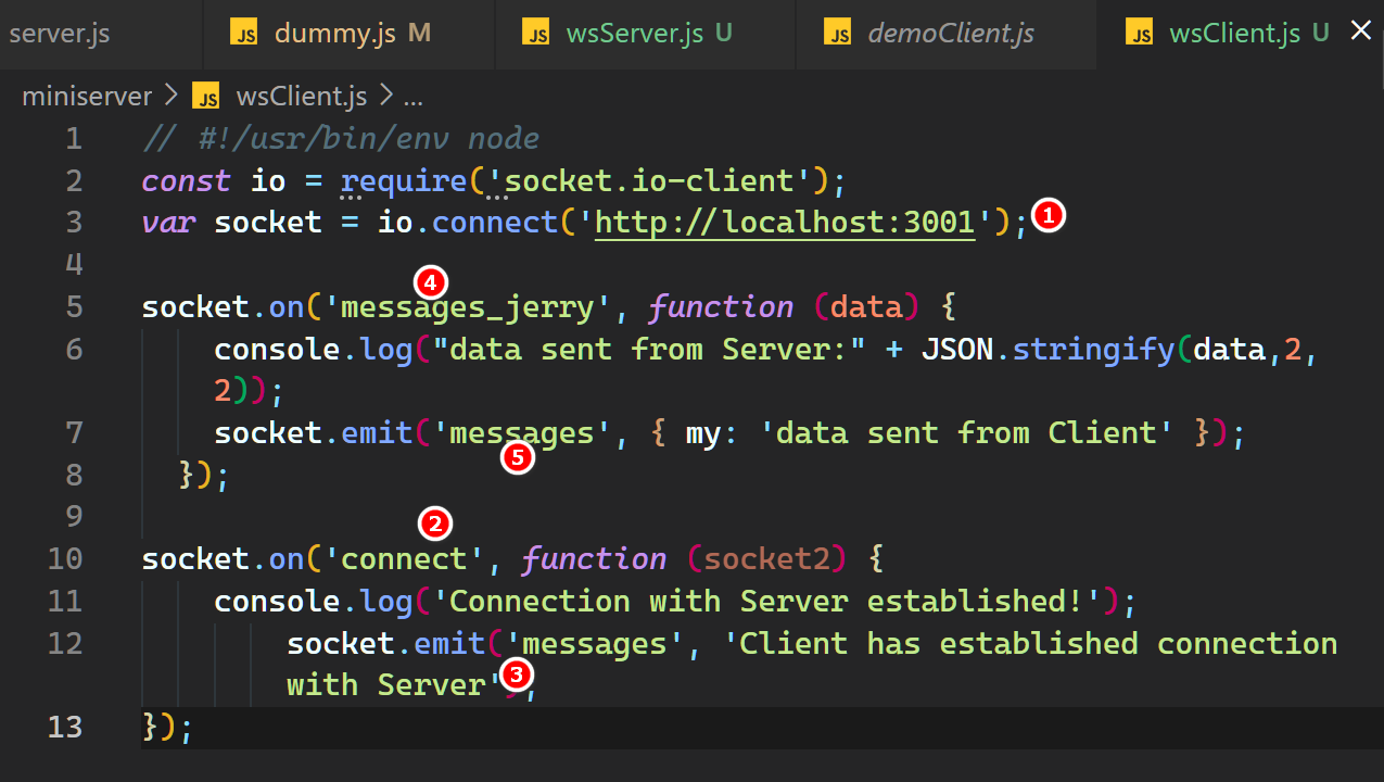 连接成功建立后,客户端第 10 行的 on 监听函数触发,该函数监听在