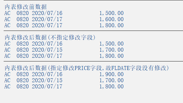 【摘要】 本文主要介绍一下SAP ABAP中内表的增删查改语句中的修改内表数据的相关语句,包括利用关键字修改数据,利用索引修改数据,利用WHERE语句修改数据。