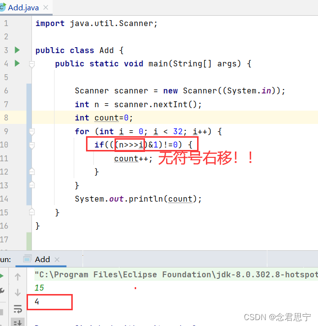 上述代码中:if(((n>>>i)&1)!=0) : 无符号右移!!可以解决负数死循环的问题!!当输入的数字为负数的时候,符号数为1,右移以后,增添1,然后会导致死循环!!