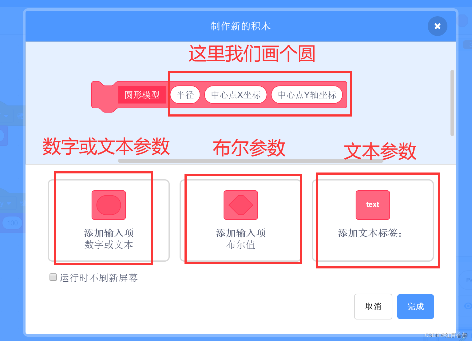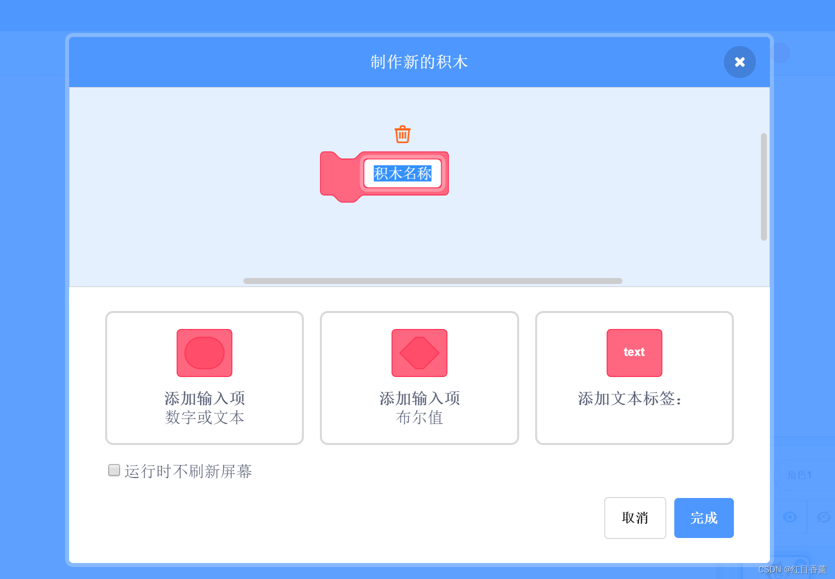 积木创建的时候可以创建三个内容,有数字或文本,布尔值,标签。