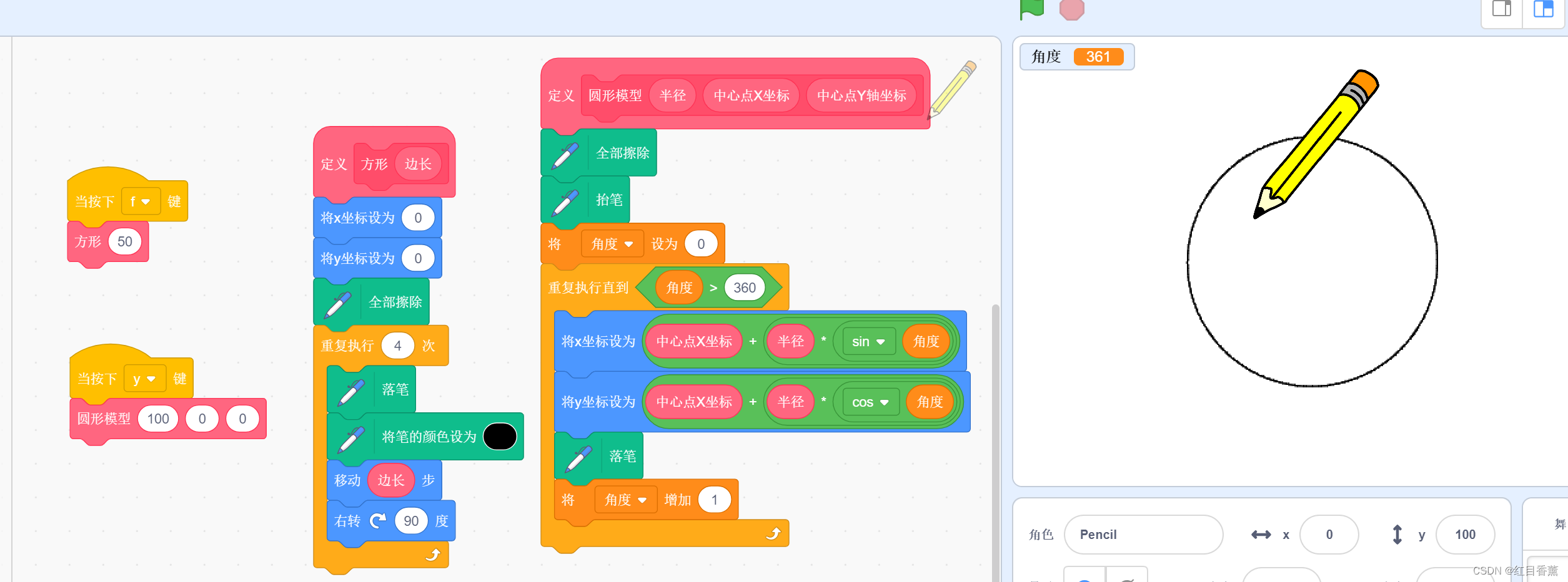 在这里我们学会了scratch的自定义函数使用,也就是【自制积木】,在后面很多的时候我们都要使用这个方法,可以方便我们来节约代码。