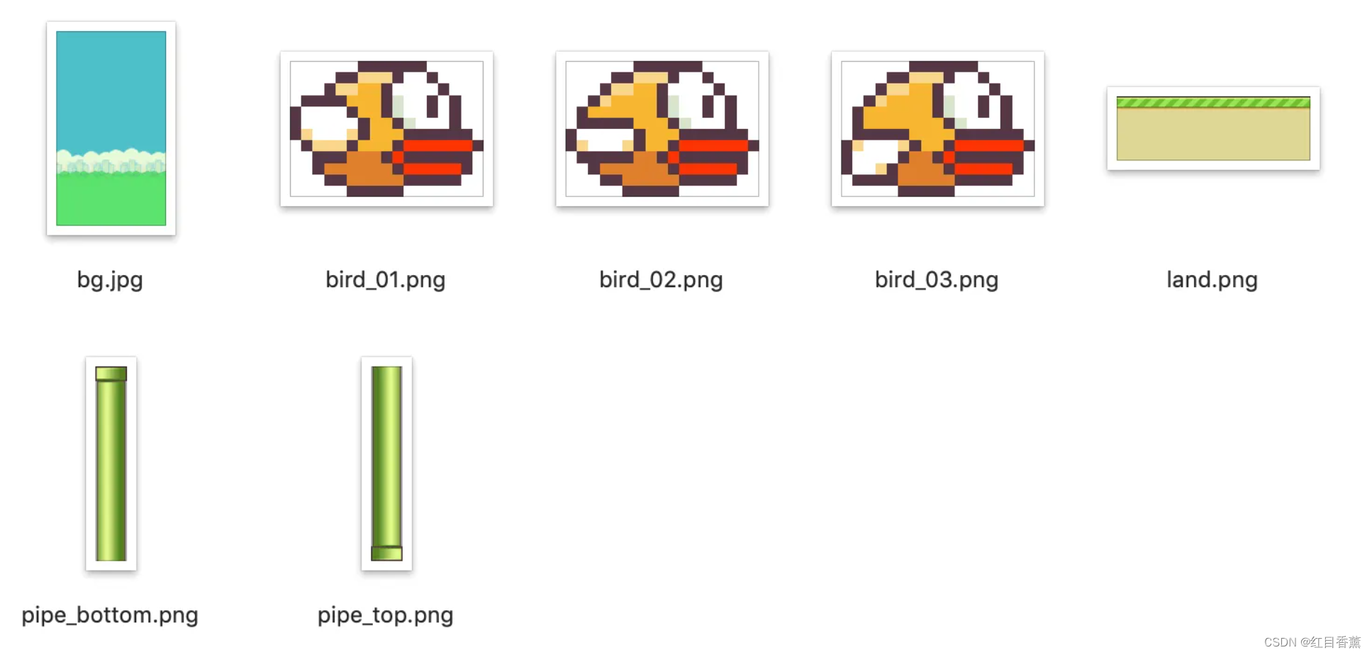 图片资源绘制效果,背景可以自己更换,鸟有3种飞行状态,地面就一种,水管主要是上下两个部分。