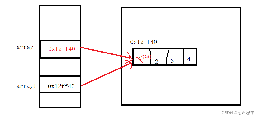 情况2:形参修改指向对象的值: array[0]=99,此时才会影响到实参!