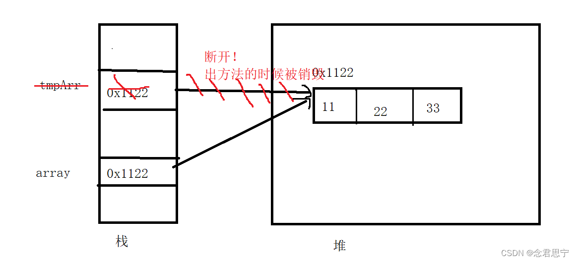 解析:tmpArr 是在函数里面创建的局部变量!当遇见return 的时候,这个方法就结束了,那么tmpArr 就会被回收掉了(销毁),那么,就意味着,tmpArr把值传递给array后,就被回收了!!
