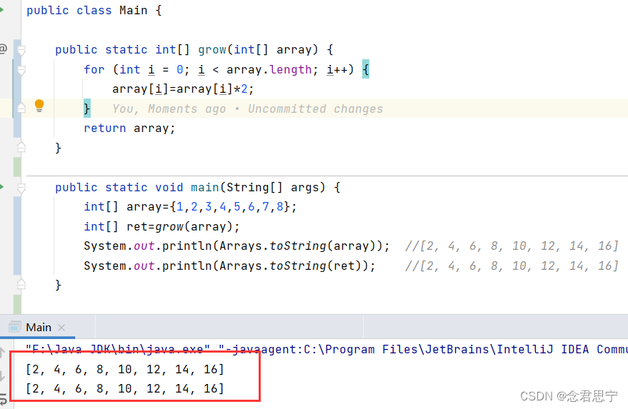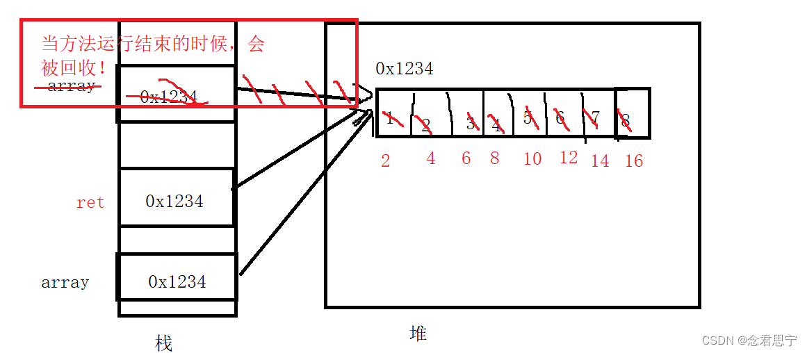 总结: 所谓的 "引用" 本质上只是存了一个地址. Java 将数组设定成引用类型, 这样的话后续进行数组参数传参, 其实 只是将数组的地址传入到函数形参中. 这样可以避免对整个数组的拷贝(数组可能比较长, 那么拷贝开销就会很大).