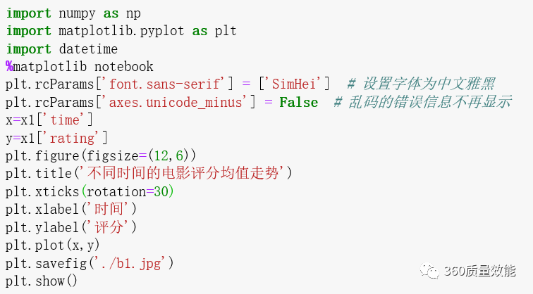 按照时间分组,然后进行评分均值聚合统计,接着将数据绘制成折线图,便于了解影评分数均值随时间的变化情况,最后将所绘制的图形可通过savefig保存。