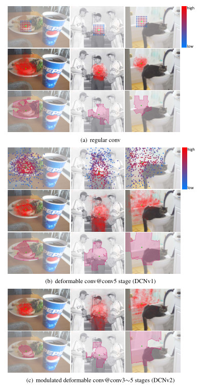 以上是DCNv1的主要思想,在之后DCNv2主要做了两点改进,一是在网络结构中增加了可变形卷积层的使用(Stacking More Deformable Conv Layers),二是在偏移值上又增加了一个权值(Modulated Deformable Modules)。对于DCNv1,作者发现在实际的应用中,其感受野对应位置超出了目标范围,导致特征不受图像内容影响。在DCNv2中,其主要改进点为引入了幅度调制机制,让网络学习到每一个采样点偏移量的同时也学习到这一采样点的幅度(即该特征点对应的权重。)使得网络在具备学习空间形变能力的同时具备区分采样点重要性的能力。(此改进是否为注意力机制?)
