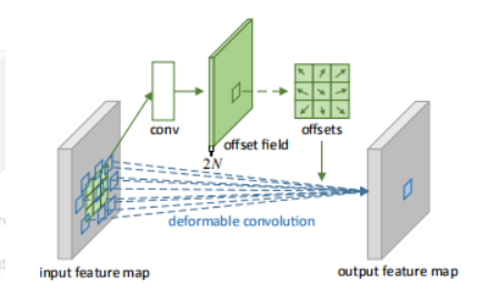接下来,我们思考一下该如何实现这种卷积的形变,我们明确一点,在这里我们不可能真的让卷积核进行形变,那我们该如何实现呢?答案如下所示,通过给卷积的位置加一个偏移值(offset)来实现卷积的“变形”,加上该偏移量的学习之后,可变形卷积核的大小和位置能够根据图像内容进行动态调整,其直观效果就是不同位置的卷积核采样点位置会根据图像内容发生自适应变化,从而适应不同目标物体的几何形变。