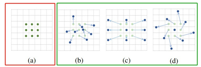 这里我们首先看一下我们正常使用的规整卷积和可变形卷积之间的对比图。如下图所示: