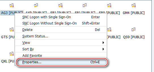 我们可以在 SAPGUI 里右键单击目标系统,在右键菜单里选择 Properties 查看需要填写的字段内容: