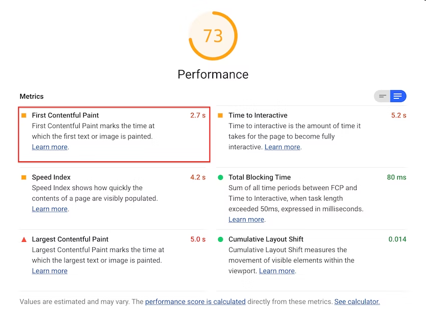 First Contentful Paint (FCP) 是 Lighthouse 报告的性能部分跟踪的六个指标之一。每个指标都捕获页面加载速度的某些方面。