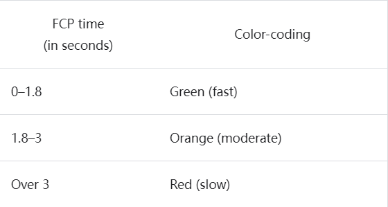 FCP 在 1.8 秒之内,显示为绿色;1.8 秒到 3 秒之内,显示为橙色,超过 3 秒显示为红色,被判定为慢速。