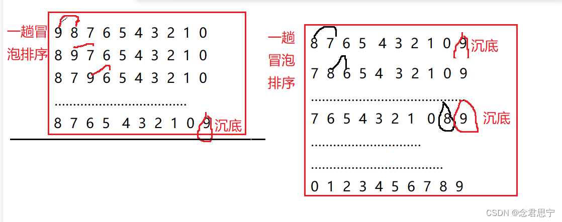 首先:1.对于n个数字,我们需要进行n-1趟冒泡排序,毕竟最后一趟冒泡排序,因为没有数字比较,所以也就不用进行了!!2.每次的冒泡排序都会有一个沉底的部分,这个沉底的就是确定下来的值!不用再参与比较大小,所以每次都会进行-1运算,但是随着趟数 i 的增加,细心的你,不知道是否能够发现趟数 i 与每次冒泡排序执行 j 过程之间的关系呢???每次比较的都是arr[j]与arr[j+1],而且这样写,也不用害拍数组越界!毕竟第一次时候,j=sz-1-0=sz-1,所以此时的arr[j+1]恰好指向最后一个元素!!