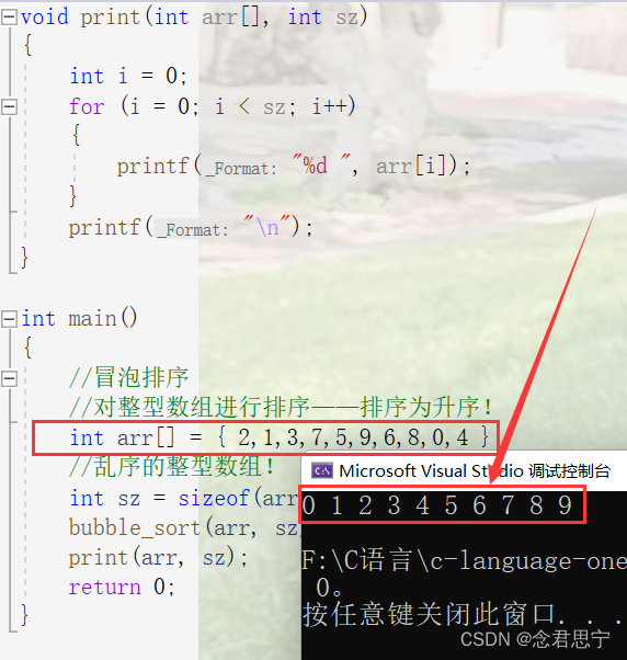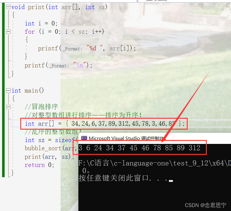 当然,对于数组arr[]读者也可以进行键盘输入,这个可以实现对多组数组进行排序,但是笔者在此就不做过多的更改,因为,太简单了!!!