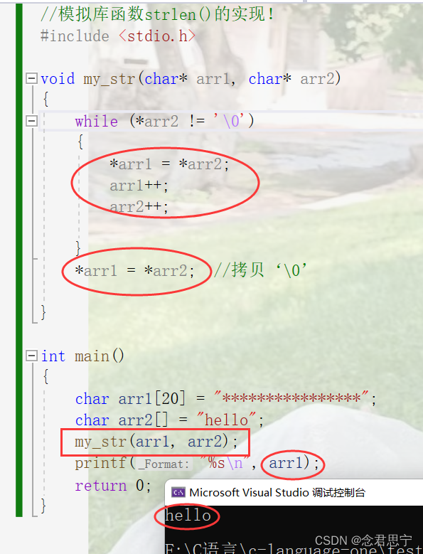 对于在函数体部分:while ()循环,对于()里面的内容一直循环判断,直到: *arr2 == '\0' 时候,条件不成立,结束while ()循环!