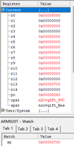 LDMIA R0!,{R4-R11} ;将以R0起始地址的值存入R4-R11,即把R4~R11清空赋值为0.