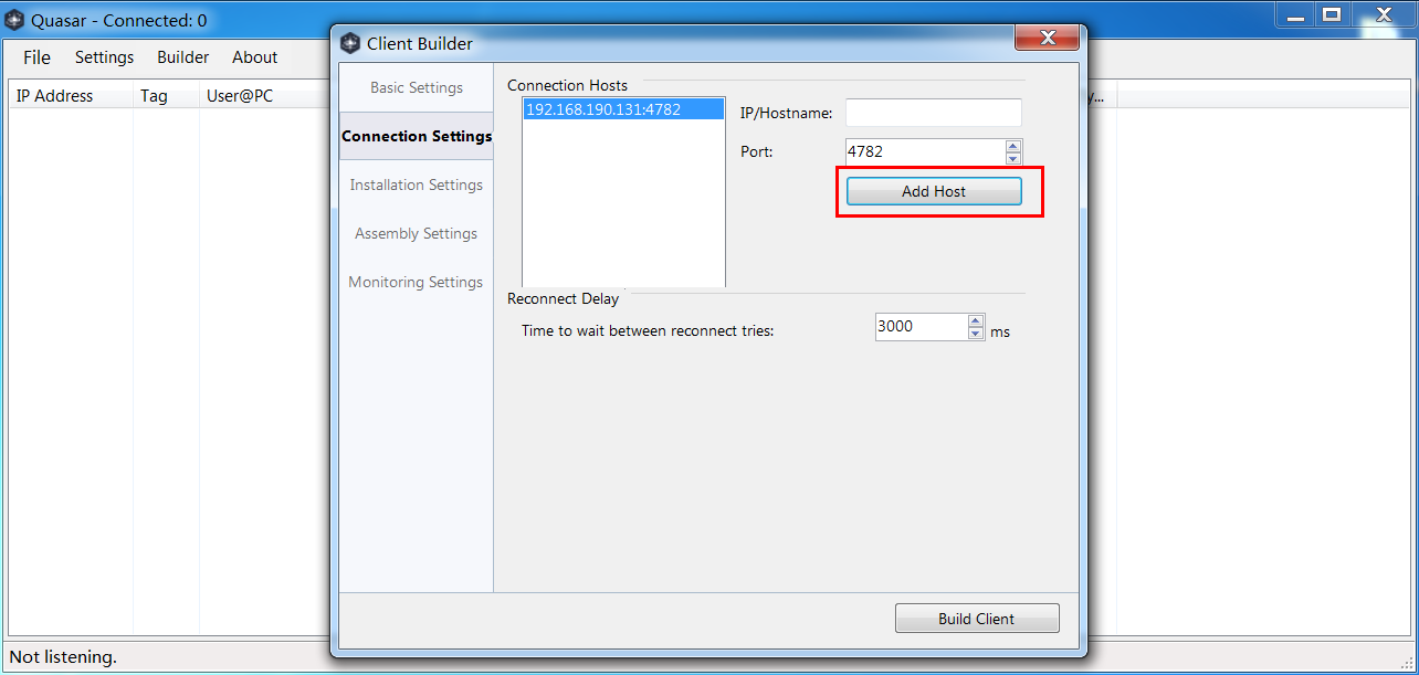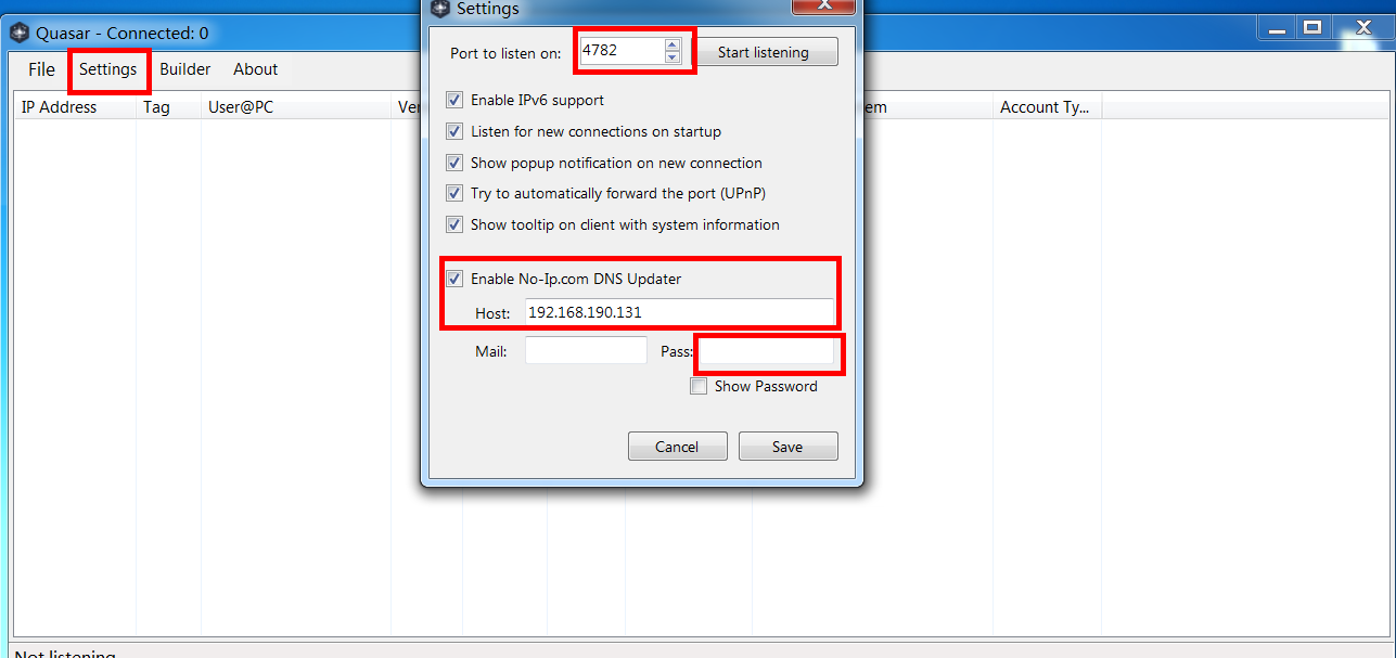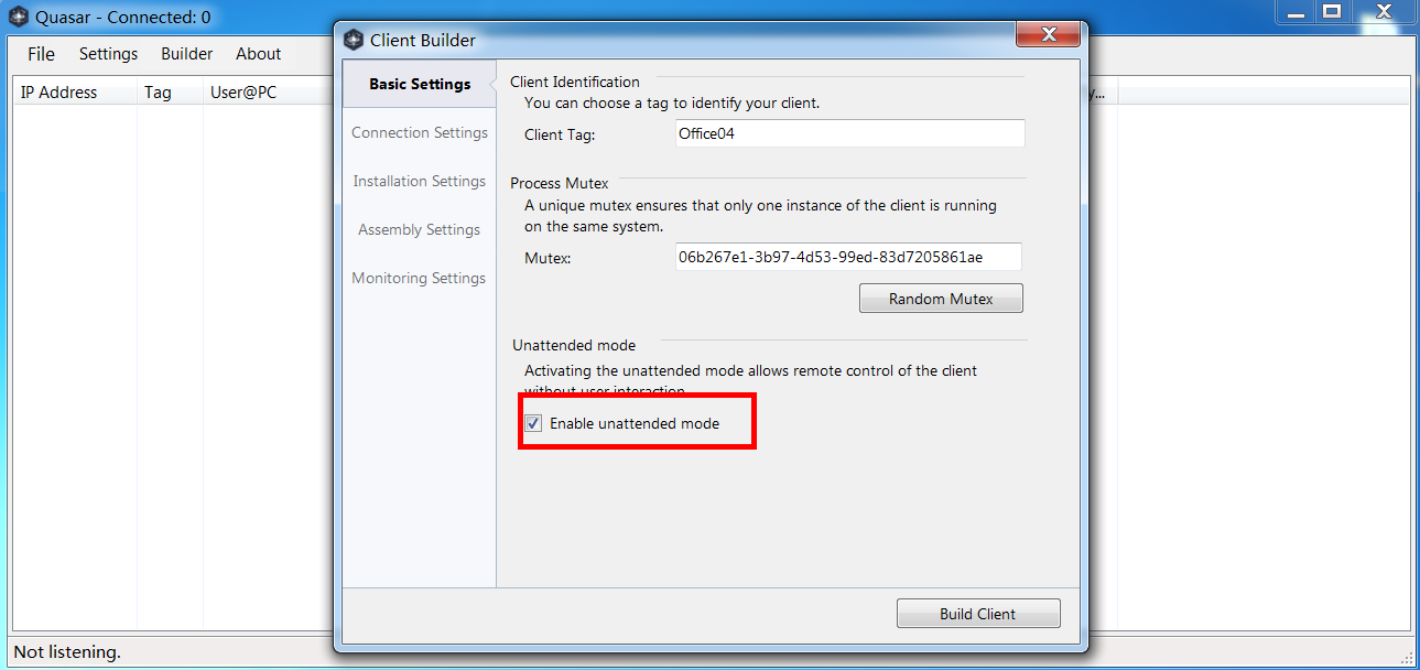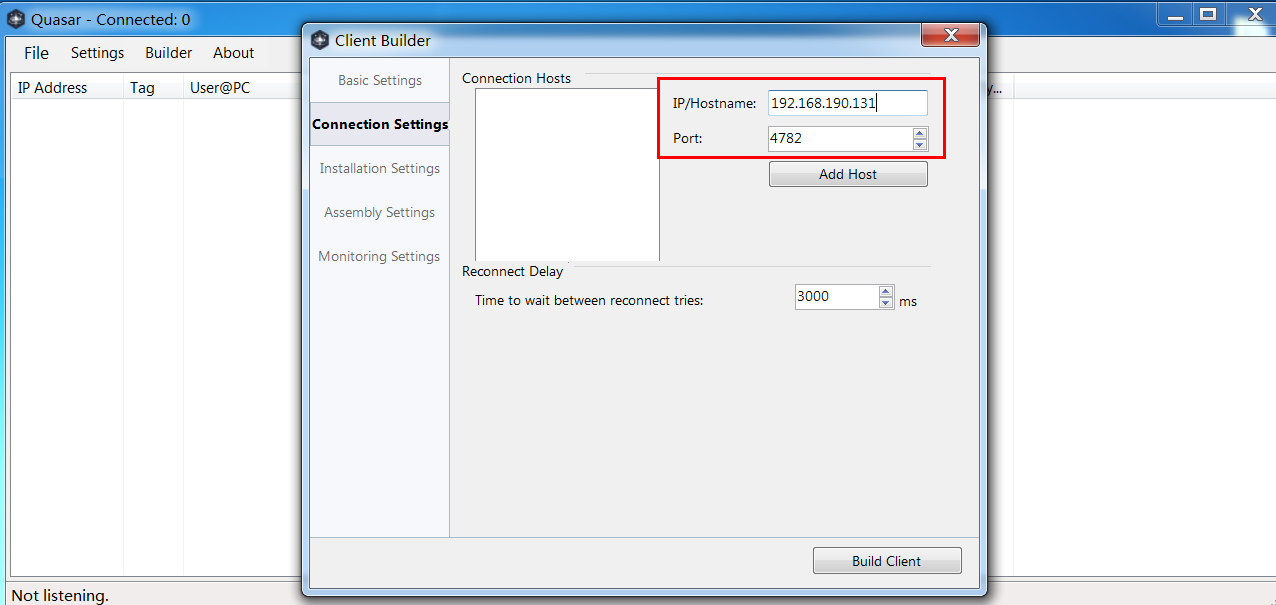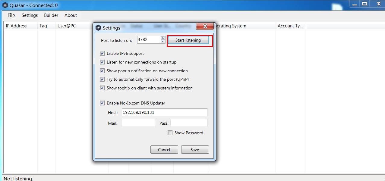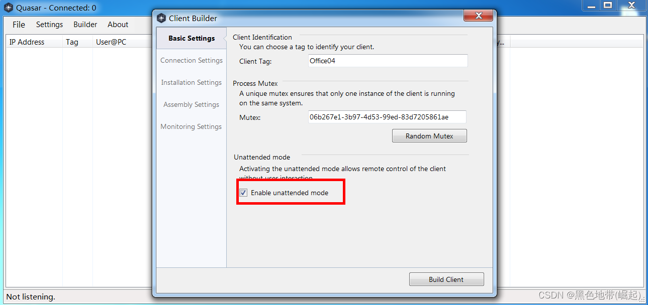 在控制端PC2上运行Quasar,点击Settings并选择开始监听端口,很快就发现客户端上线