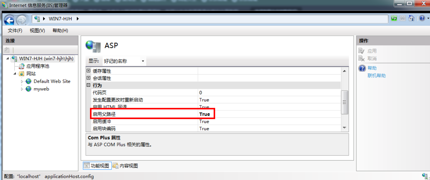 ②在主页 IIS中找到ASP,并双击-------->将启用父路径改为Ture